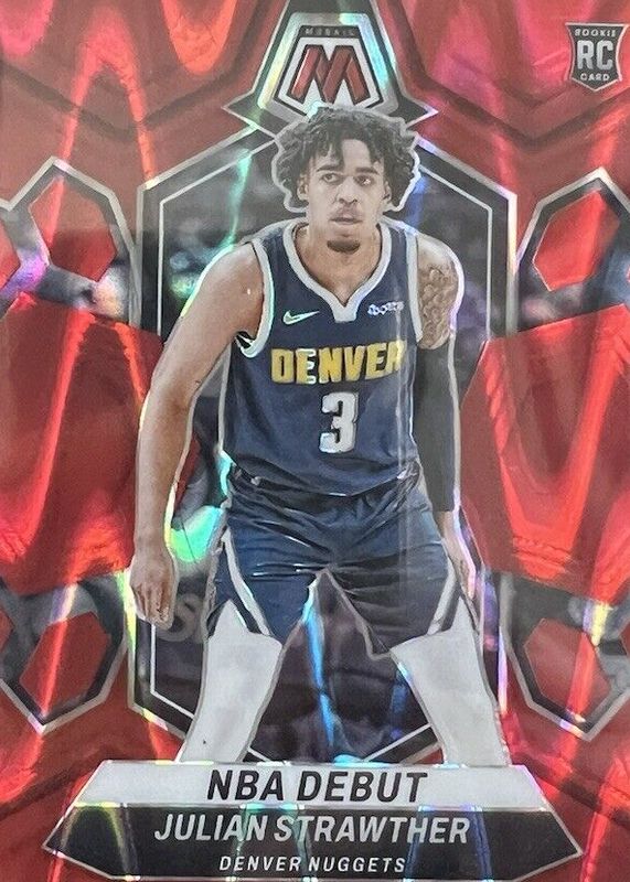 The Julian Strawther 2023 Mosaic #256 NBA Debut - Red Seismic /299 Rookie card in Raw condition has not changed in price in the last 30 days and was last sold for $6.00 .