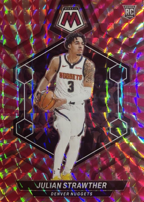 The Julian Strawther 2023 Mosaic #214 Pink Swirl /18 Rookie card in Raw condition has not changed in price in the last 30 days and was last sold for $29.99 .