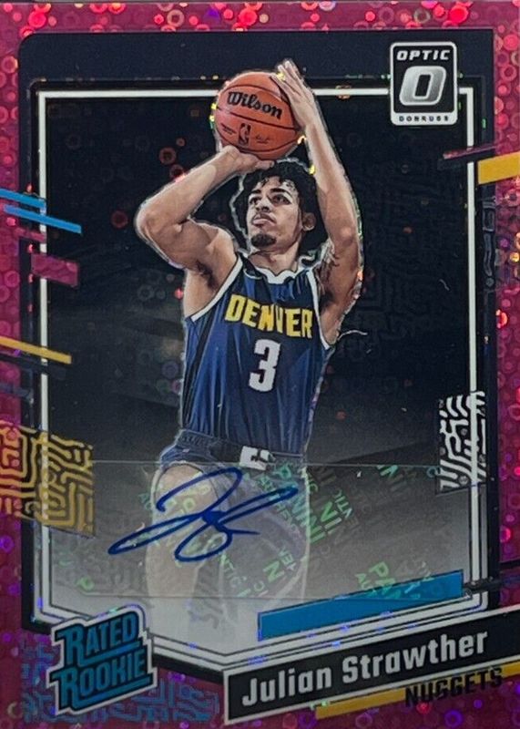 The Julian Strawther 2023 Optic #283 Rated Rookie Signatures - Fast Break Pink /25 card in Raw condition has not changed in price in the last 30 days and was last sold for $22.48 .