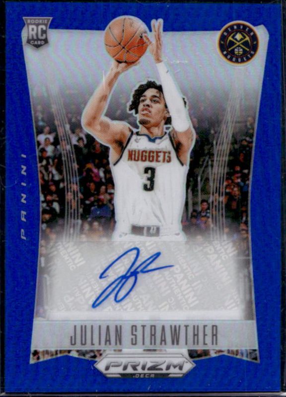 The Julian Strawther 2023 Prizm Deca #DS-STR Signatures - Blue Rookie card is 1 of 21 Julian Strawther's card variations in the 2023 Prizm Deca set being tracked by Sports Card Investor, including Base, Silver, Red /199, Blue /149, and Purple /99.
