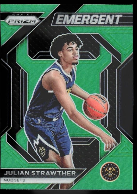 The Julian Strawther 2023 Prizm #21 Emergent - Green Rookie card is 1 of 98 Julian Strawther's card variations in the 2023 Prizm set being tracked by Sports Card Investor, including Base, Blue Wave, Choice Blue Yellow Green, Fast Break, and Green.
