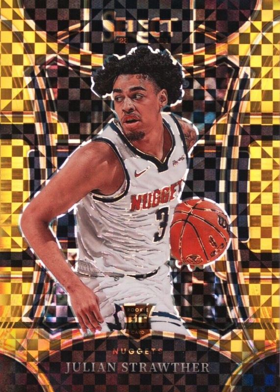 The Julian Strawther 2023 Select #318 Mezzanine Gold /10 Rookie card in Raw condition has not changed in price in the last 30 days and was last sold for $48.00 .
