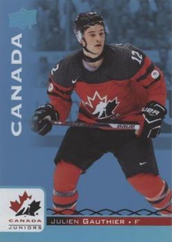 The Julien Gauthier 2017 Upper Deck Team Canada Juniors #12 Blue Spectrum card is 1 of 14 Julien Gauthier's card variations in the 2017 Upper Deck Team Canada Juniors set being tracked by Sports Card Investor, including Base, Red Exclusives /199, High Gloss /25, Black Parallel /5, and Canada Jerseys.