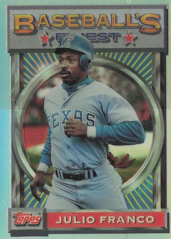 Julio Franco's Baseball cards are available in at least 66 sets. Julio Franco's biggest 7-day price movers are 1993 Topps Finest #161 Refractor, 2021 Topps Archives #FFA-JFR Fan Favorites Autographs, and 2021 Topps Archives #FFA-JFR Fan Favorites Autographs - Purple /150.