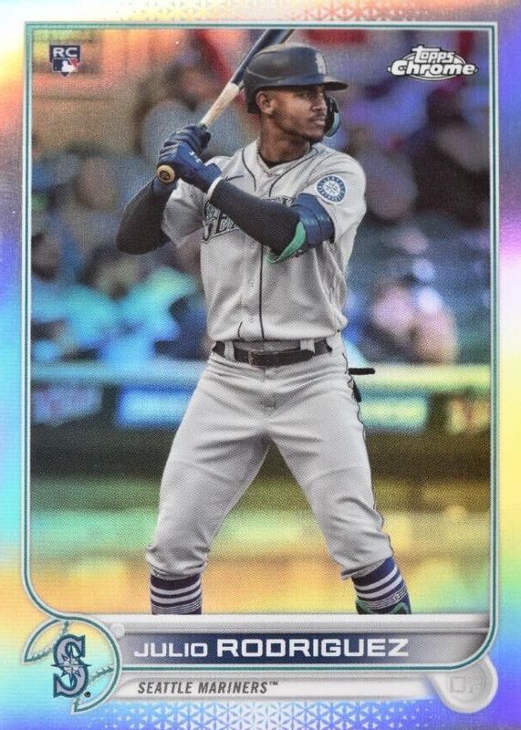 This card is 1 of 16 Julio Rodriguez's card variations in the 2022 Topps Chrome set being tracked by Sports Card Investor, including Rookie Auto, Rookie Auto - Refractor /499, Rookie Auto - Purple Speckle Refractor /299, Rookie Auto - Purple Refractor /250, and Rookie Auto - Aqua Wave Refractor /199.
