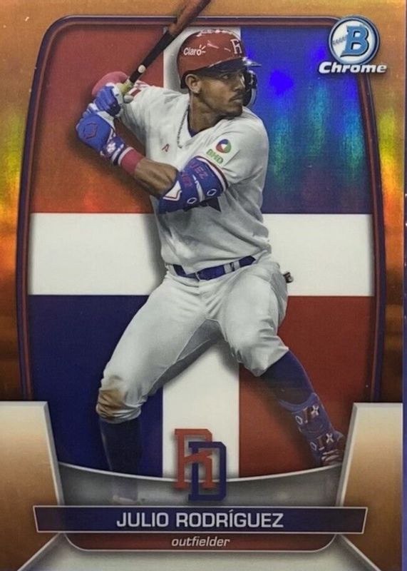 The Julio Rodriguez 2023 Bowman Chrome #WBC-27 WBC Flag - Orange Refractor /25 card in Raw condition has not changed in price in the last 30 days and was last sold for $43.69 .