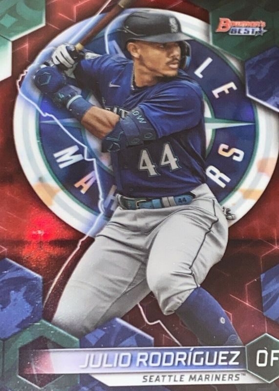 This card is 1 of 13 Julio Rodriguez's card variations in the 2023 Bowman's Best set being tracked by Sports Card Investor, including Wave Refractor, Mini-Diamond Refractor /299, Purple Refractor /250, Aqua Lava Refractor /199, and Blue Refractor /150.