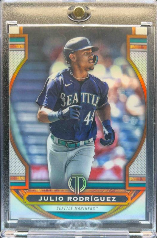 The Julio Rodriguez 2023 Topps Tribute #10 Orange /25 card is 1 of 19 Julio Rodriguez's card variations in the 2023 Topps Tribute set being tracked by Sports Card Investor, including Base, Green /99, Gold /75, Purple /50, and Red /10.