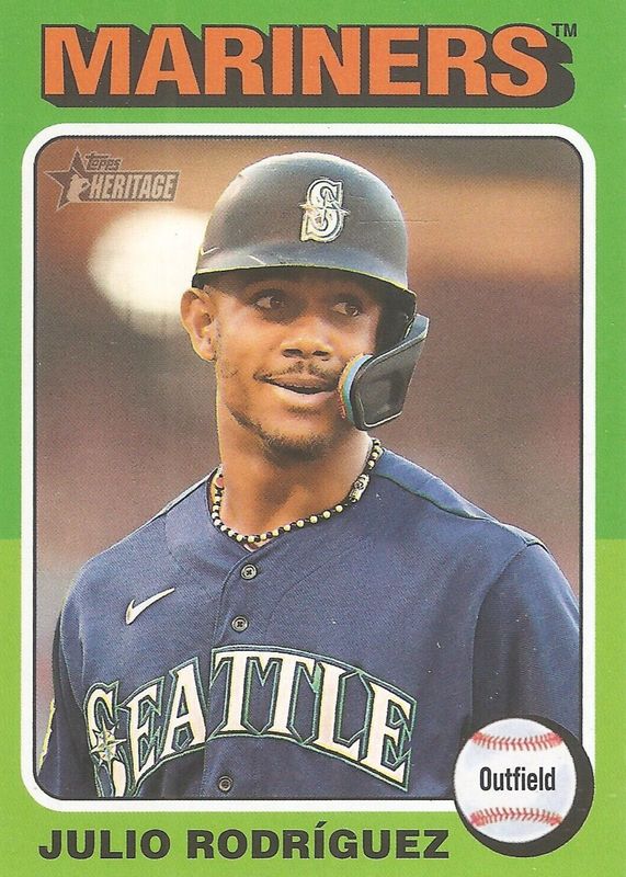 This card is 1 of 11 Julio Rodriguez's card variations in the 2024 Topps Heritage set being tracked by Sports Card Investor, including Image Variation, Throwback Uniform Variation, Chrome - Blue Sparkle Refractor, Real One Autographs, and Chrome - Refractor /575.