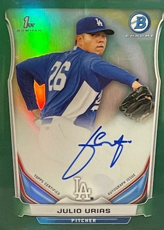 The Julio Urias 2014 Bowman Chrome #BCAP-JU Prospect Auto - Green Refractor /75 (1st) card in Raw condition has not changed in price in the last 30 days and was last sold for $30.00 .