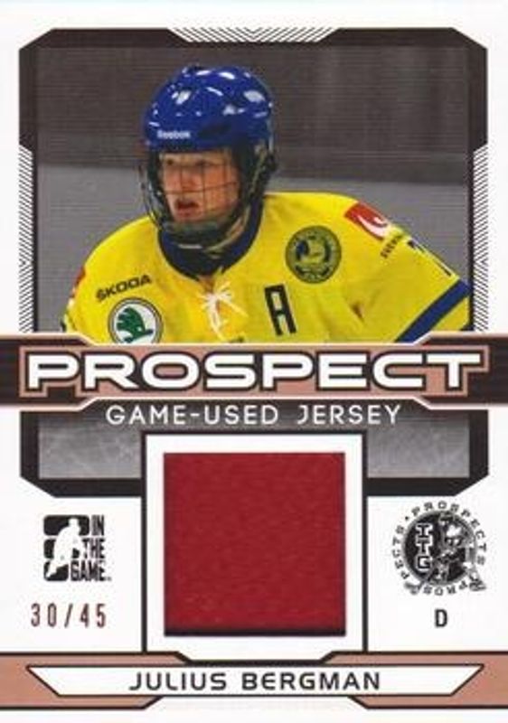 The Julius Bergman 2014 In The Game Draft Prospects #PGU-16 Jerseys - Bronze /45 card is 1 of 30 Julius Bergman's card variations in the 2014 In The Game Draft Prospects set being tracked by Sports Card Investor, including Base, Bronze /25, Silver /10, Gold /1, and Printing Plates Black /1.