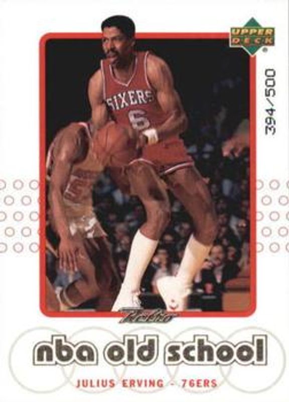 The Julius Erving 1999 Upper Deck Retro #S4 Old School/New School - Parallel /500 card is 1 of 9 Julius Erving's card variations in the 1999 Upper Deck Retro set being tracked by Sports Card Investor, including Base, Gold /250, Platinum /1, Distant Replay, and Lunchboxes.