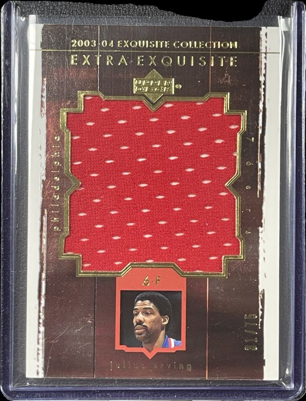 The Julius Erving 2003 Upper Deck Exquisite Collection #EE-JE Extra Exquisite /75 card is 1 of 5 Julius Erving's card variations in the 2003 Upper Deck Exquisite Collection set being tracked by Sports Card Investor, including Number Pieces Patch Autographs (/6), Patches Autographs /100, Extra Exquisite Duals /25, and Patches Triple /10.