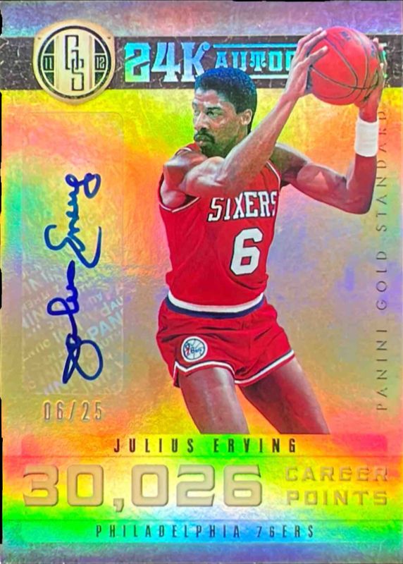 The Julius Erving 2011 Gold Standard #2 24K Autographs /25 card is 1 of 12 Julius Erving's card variations in the 2011 Gold Standard set being tracked by Sports Card Investor, including #8 Private Signings, #BG-63 Black Gold Threads /149, #GR-45 Gold Rush /49, #14 Golden 50 - Materials /25, and #20 Golden 50 - Materials /25.