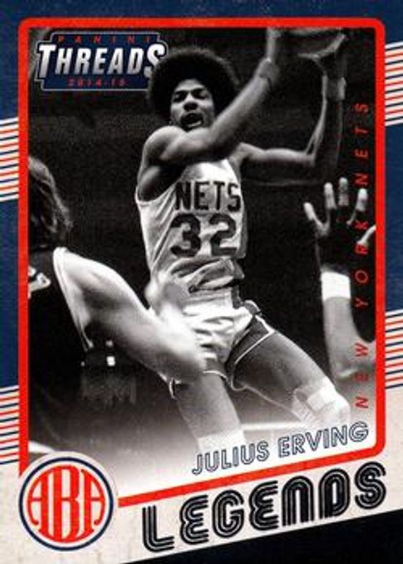 The Julius Erving 2014 Threads #4 ABA Legends card is 1 of 15 Julius Erving's card variations in the 2014 Threads set being tracked by Sports Card Investor, including Base, Century Proof Red /199, Century Proof Gold /25, Century Proof Platinum /1, and Century Greats.