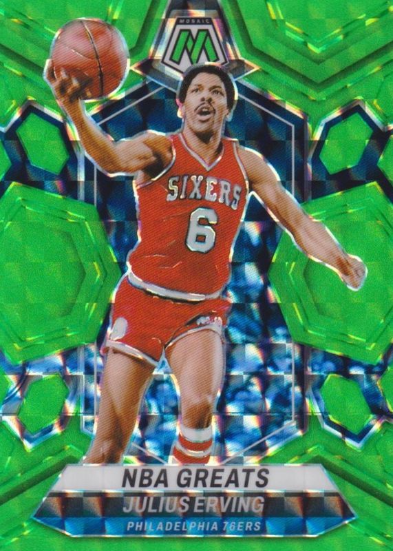 The Julius Erving 2023 Mosaic #292 NBA Greats - Green Fluorescent /10 card in Raw condition has not changed in price in the last 30 days and was last sold for $21.26 .