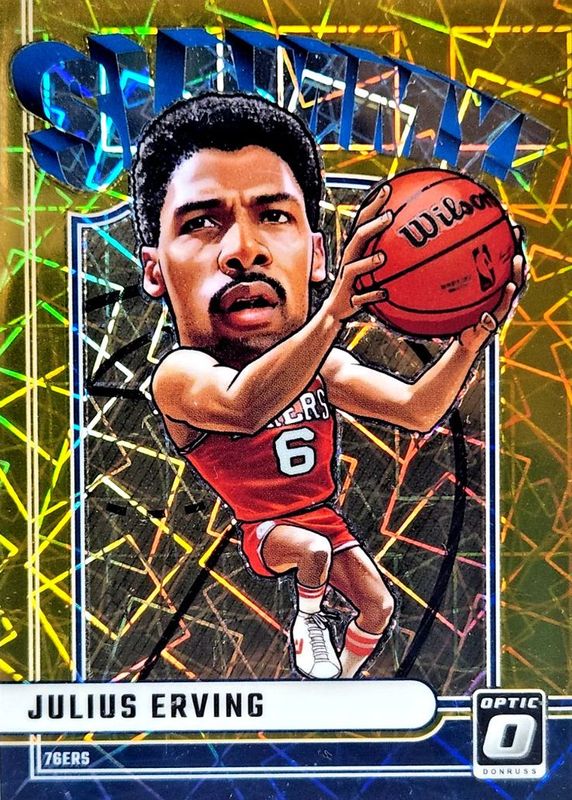 This card is 1 of 6 Julius Erving's card variations in the 2024 Optic set being tracked by Sports Card Investor, including Alter Ego /(SSP), Slammy! /(SSP), Alter Ego - Gold /10, Alter Ego - Gold Vinyl /1, and Slammy! - Gold Vinyl /1.