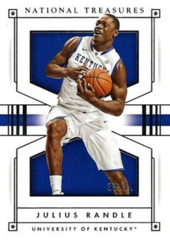 The Julius Randle 2016 National Treasures Collegiate #27 Base /99 card is 1 of 10 Julius Randle's card variations in the 2016 National Treasures Collegiate set being tracked by Sports Card Investor, including Red /49, Silver /25, Gold /10, Black /5, and Platinum /1.