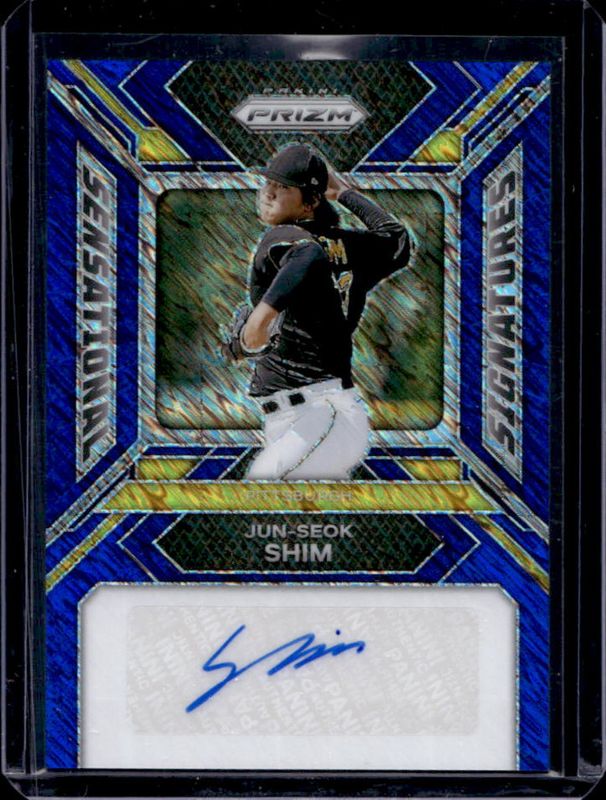 The Jun-Seok Shim 2024 Prizm #SS-JS Sensational Signatures - Blue Shimmer FOTL /8 card is 1 of 42 Jun-Seok Shim's card variations in the 2024 Prizm set being tracked by Sports Card Investor, including Base, Blue Ice, Green, Green Ice, and Pink Ice.