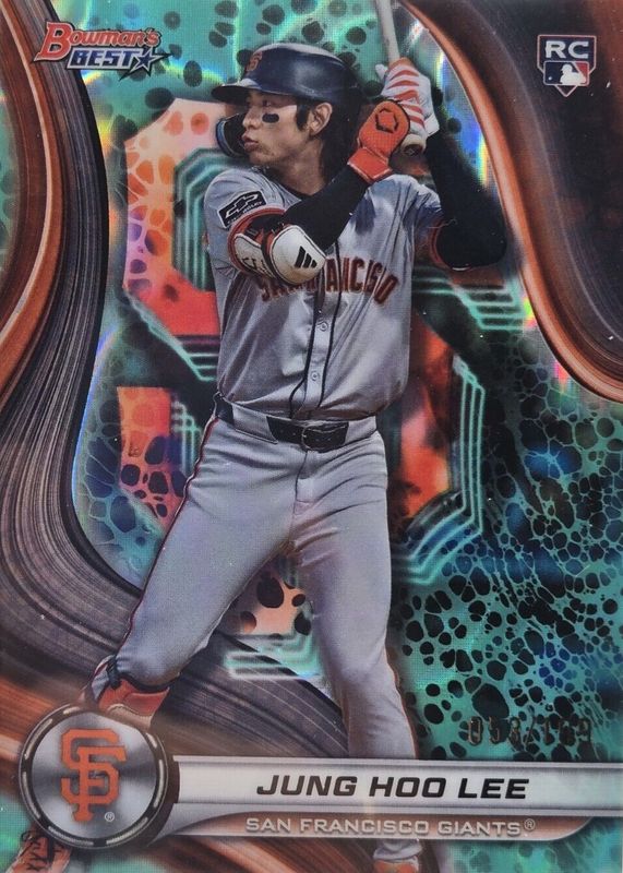 The Jung Hoo Lee 2024 Bowman's Best #57 Aqua Lava Refractor /199 Rookie card in Raw condition has moved up $3.62 (+240%) in the last 30 days and was last sold for $5.13 .