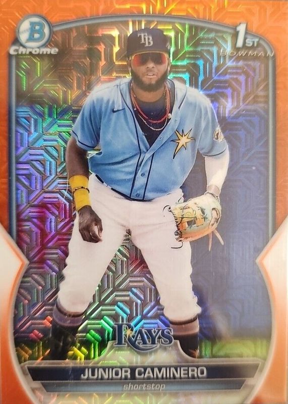 Best Prices Available For Sale of Junior Caminero 2023 Bowman Mega Box #BCP-61 Chrome Prospects - Orange Mojo Refractor /25 (1st)