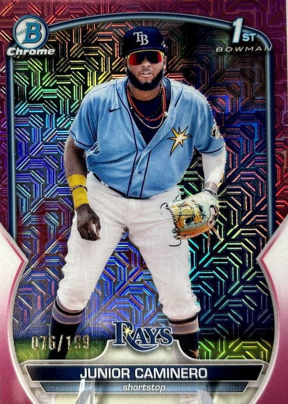 Best Prices Available For Sale of Junior Caminero 2023 Bowman Mega Box #BCP-61 Chrome Prospects - Pink Mojo Refractor /199 (1st)