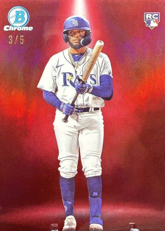 The Junior Caminero 2024 Bowman #BS-8 Bowman Spotlights - Red Refractor /5 Rookie card in Raw condition has not changed in price in the last 30 days and was last sold for $535.00 .