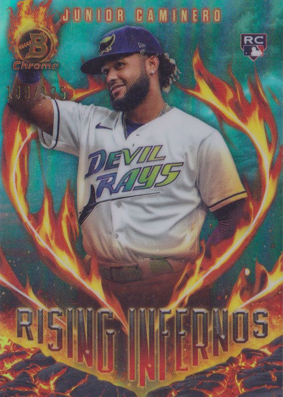 Best Prices Available For Sale of Junior Caminero 2024 Bowman #RI-6 Rising Infernos - Aqua Refractor /125