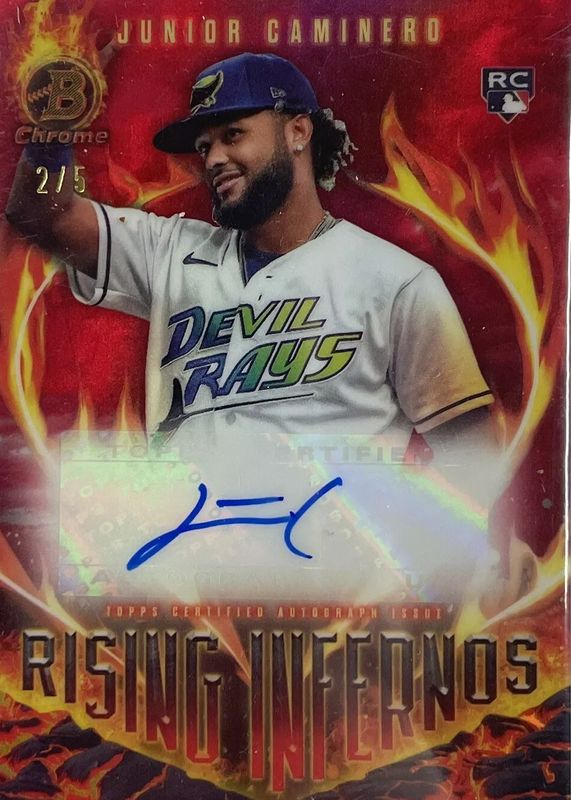 The Junior Caminero 2024 Bowman #RIA-JC Rising Infernos Autographs - Red Refractor /5 Rookie card in Raw condition has not changed in price in the last 30 days and was last sold for $172.50 .