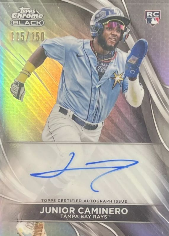 The Junior Caminero 2024 Topps Chrome Black #CBA-JCA Autographs - Refractor /150 Rookie card in Raw condition has not changed in price in the last 30 days and was last sold for $149.00 .