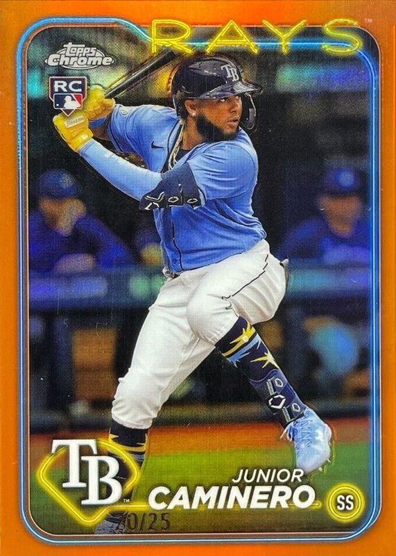 The Junior Caminero 2024 Topps Chrome #213 Orange Refractor /25 Rookie card in Raw condition has not changed in price in the last 30 days and was last sold for $299.99 .