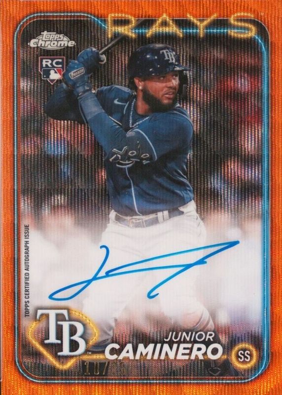 Auctions Ending Soon for Junior Caminero 2024 Topps Chrome #RA-JCA Rookie Autographs - Orange Wave Refractor /25 RAW