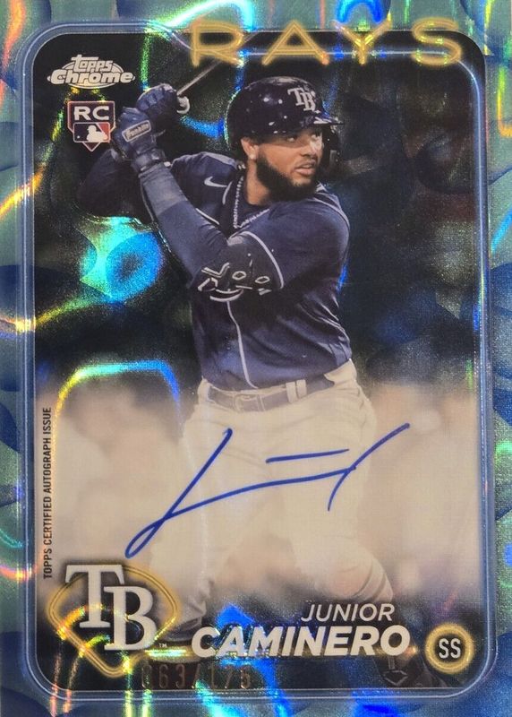 The Junior Caminero 2024 Topps Chrome Update #RA-JCA Autographs - Aqua & Blue Lava Lamp Refractor /175 Rookie card in Raw condition has not changed in price in the last 30 days and was last sold for $194.25 .