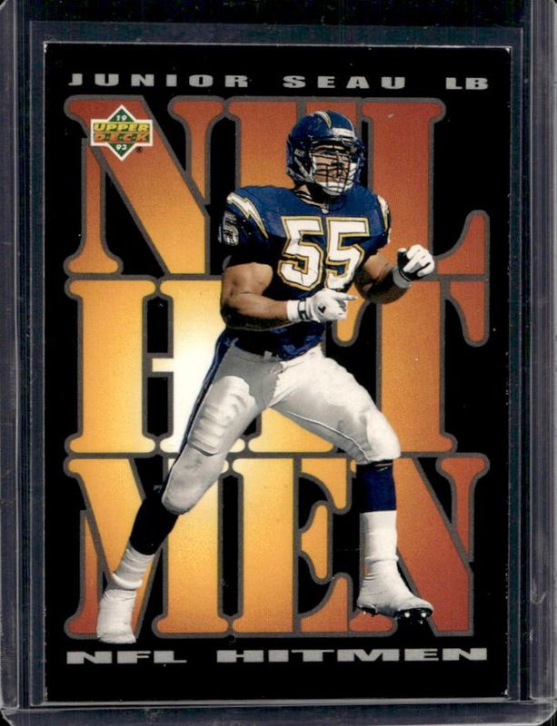 The Junior Seau 1993 Upper Deck #57 Base card is 1 of 5 Junior Seau's card variations in the 1993 Upper Deck set being tracked by Sports Card Investor, including Base, Future Heroes, Pro Bowl, and Team MVP.