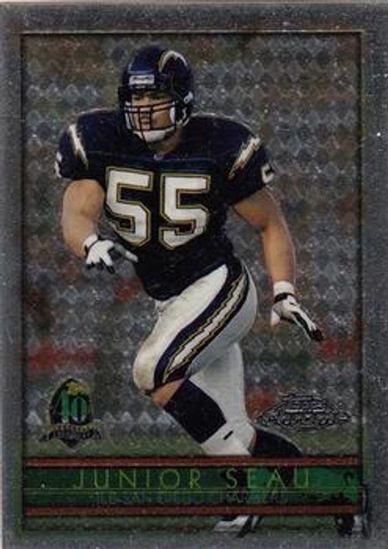 The Junior Seau 1996 Topps Chrome #4 Base card is 1 of 4 Junior Seau's card variations in the 1996 Topps Chrome set being tracked by Sports Card Investor, including Refractor, 40th Anniversary Retros, and 40th Anniversary Retros - Refractor.