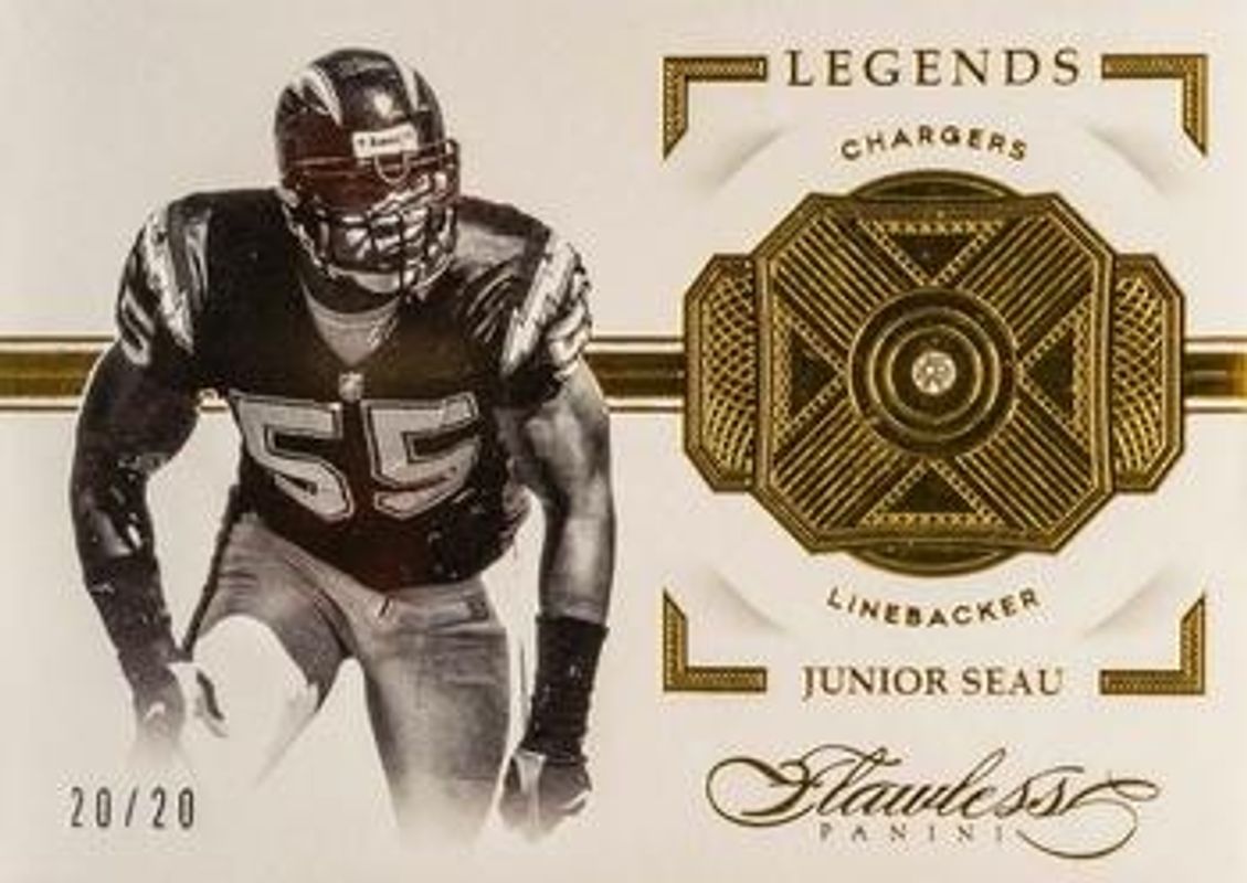 The Junior Seau 2016 Flawless #128 Base /20 card is 1 of 10 Junior Seau's card variations in the 2016 Flawless set being tracked by Sports Card Investor, including Ruby /15, Sapphire /10, Emerald /5, Platinum /1, and Patches /20.