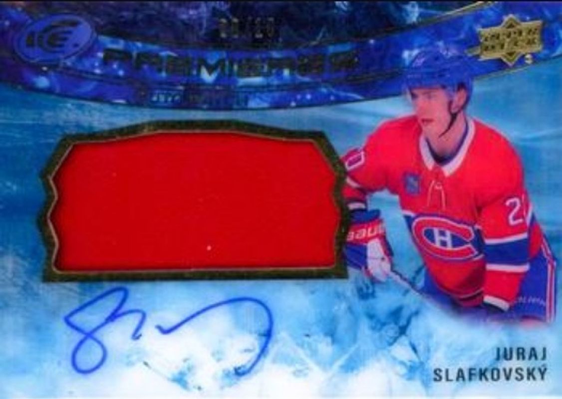 The Juraj Slafkovsky 2022 Upper Deck Ice #IP-JS Ice Premieres - Auto Patch /10 Rookie card is 1 of 55 Juraj Slafkovsky's card variations in the 2022 Upper Deck Ice set being tracked by Sports Card Investor, including #143 Base /1299, #248 Base /1299, #143 Autographs White Snowflake, #143 Gold, and #143 Green.
