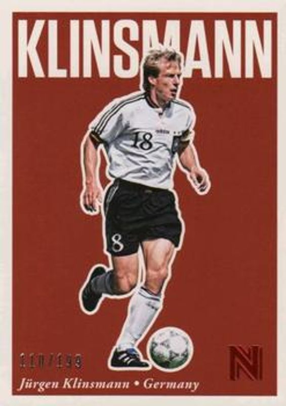 The Jurgen Klinsmann 2017 Nobility #16 Red /199 card is 1 of 13 Jurgen Klinsmann's card variations in the 2017 Nobility set being tracked by Sports Card Investor, including Base, Blue /99, Orange /75, Bronze /20, and Gold /10.