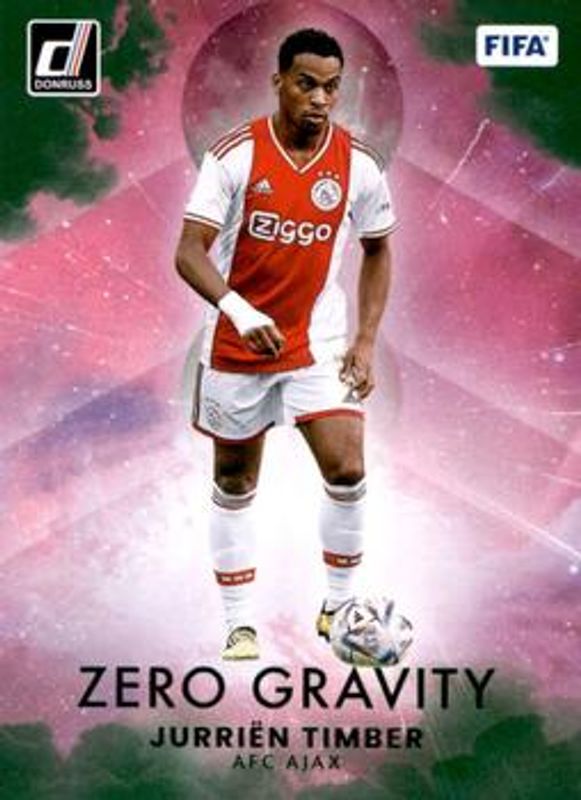 The Jurrien Timber 2022 Donruss #23 Zero Gravity - Green card is 1 of 15 Jurrien Timber's card variations in the 2022 Donruss set being tracked by Sports Card Investor, including Signatures Series, Signatures Series - Green Ice, Signatures Series - Orange Ice, Zero Gravity, and Zero Gravity - Orange.