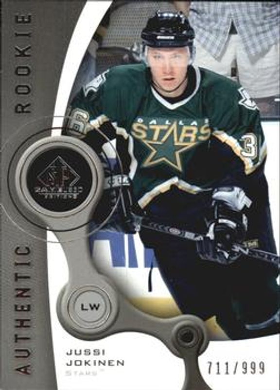 The Jussi Jokinen 2005 SP Game Used #154 Base /999 Rookie card is 1 of 7 Jussi Jokinen's card variations in the 2005 SP Game Used set being tracked by Sports Card Investor, including Gold /25, Rookie Exclusives /100, SIGnificant Numbers /24, Auto Draft /20, and Autographs /5.