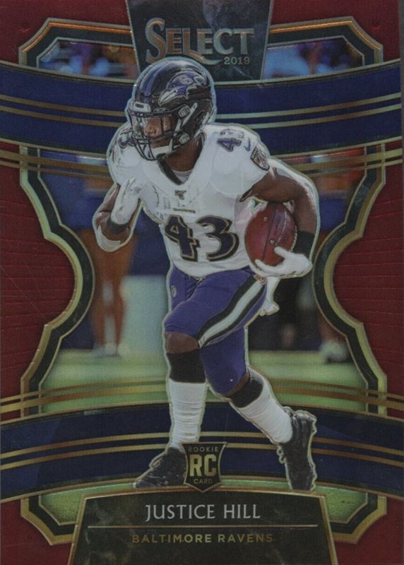 This card is 1 of 19 Justice Hill's card variations in the 2019 Select set being tracked by Sports Card Investor, including Concourse, Concourse Silver, Concourse Tri-Color /199, Concourse Blue /175, and Concourse Red /99.