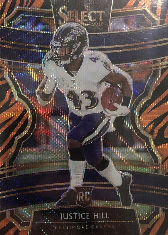 This card is 1 of 19 Justice Hill's card variations in the 2019 Select set being tracked by Sports Card Investor, including Concourse, Concourse Silver, Concourse Tri-Color /199, Concourse Blue /175, and Concourse Maroon /149.