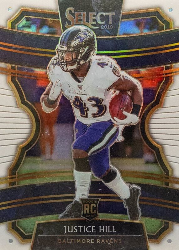 This card is 1 of 19 Justice Hill's card variations in the 2019 Select set being tracked by Sports Card Investor, including Concourse, Concourse Silver, Concourse Tri-Color /199, Concourse Blue /175, and Concourse Maroon /149.