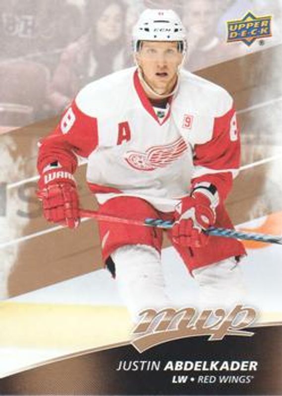 The Justin Abdelkader 2017 Upper Deck MVP #53 Base card is 1 of 10 Justin Abdelkader's card variations in the 2017 Upper Deck MVP set being tracked by Sports Card Investor, including Green Script, Puzzle Backs, Silver Script, Gold Script /100, and Super Script /25.