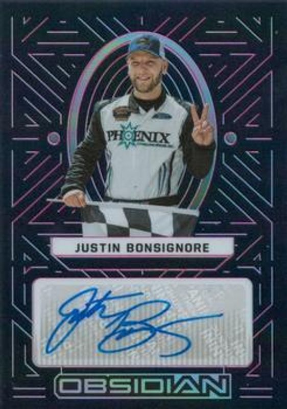 The Justin Bonsignore 2023 Chronicles NASCAR #BN Obsidian Signatures Electric Etch - Pink /25 Rookie card is 1 of 85 Justin Bonsignore's card variations in the 2023 Chronicles NASCAR set being tracked by Sports Card Investor, including Base, Blue /199, Red /99, Purple /25, and Gold /10.