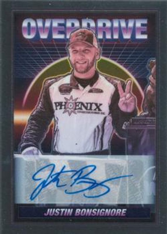 The Justin Bonsignore 2023 Chronicles NASCAR #19 Overdrive Autographs Rookie card is 1 of 85 Justin Bonsignore's card variations in the 2023 Chronicles NASCAR set being tracked by Sports Card Investor, including Base, Blue /199, Red /99, Purple /25, and Gold /10.