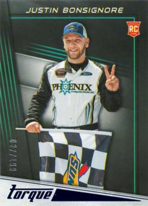 The Justin Bonsignore 2023 Chronicles NASCAR #9 Torque - Blue /199 Rookie card is 1 of 85 Justin Bonsignore's card variations in the 2023 Chronicles NASCAR set being tracked by Sports Card Investor, including Base, Blue /199, Red /99, Purple /25, and Gold /10.