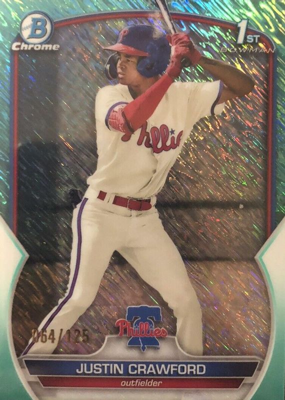 The Justin Crawford 2023 Bowman #BCP-3 Chrome Prospects - Aqua Shimmer Refractor /125 (1st) card in Raw condition has not changed in price in the last 30 days and was last sold for $18.00 .