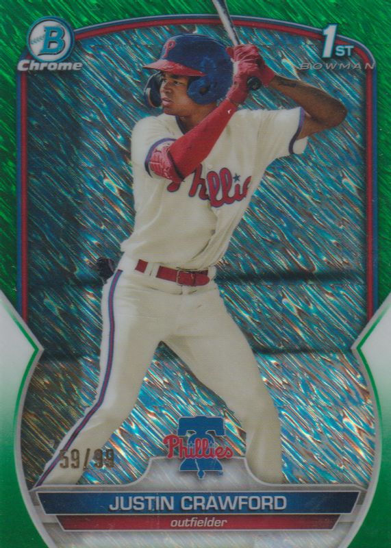 The Justin Crawford 2023 Bowman #BCP-3 Chrome Prospects - Green Shimmer Refractor /99 (1st) card in Raw condition has not changed in price in the last 30 days and was last sold for $39.34 .