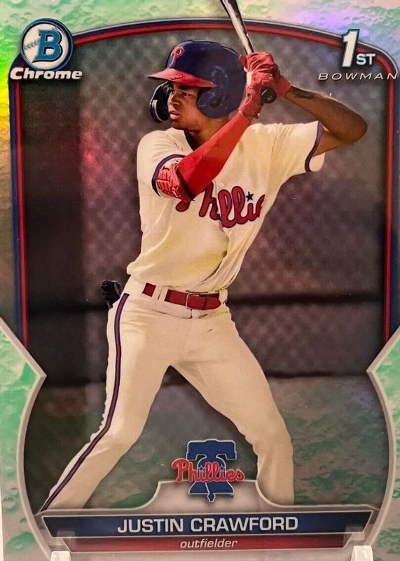 The Justin Crawford 2023 Bowman #BCP-3 Chrome Prospects - Lunar Glow Refractor (1st) card in Raw condition has moved down -$3.28 (-43.5%) in the last 30 days and was last sold for $4.25 .